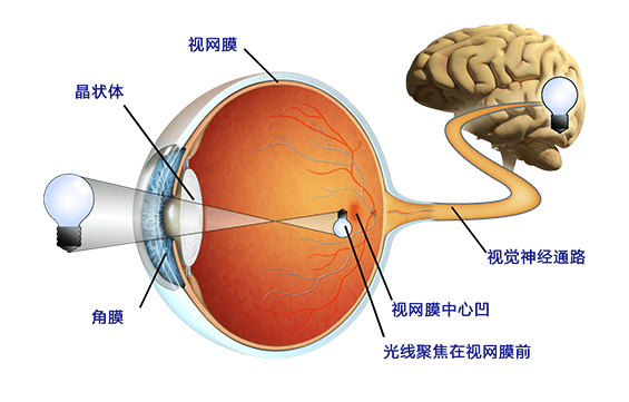 模糊的影像使眼对聚焦的敏感性下降,触发视网膜神经介质2-视网膜黏蛋白介导的巩膜生长机制,使巩膜扩张加速,眼轴延长,促使眼球近视化。